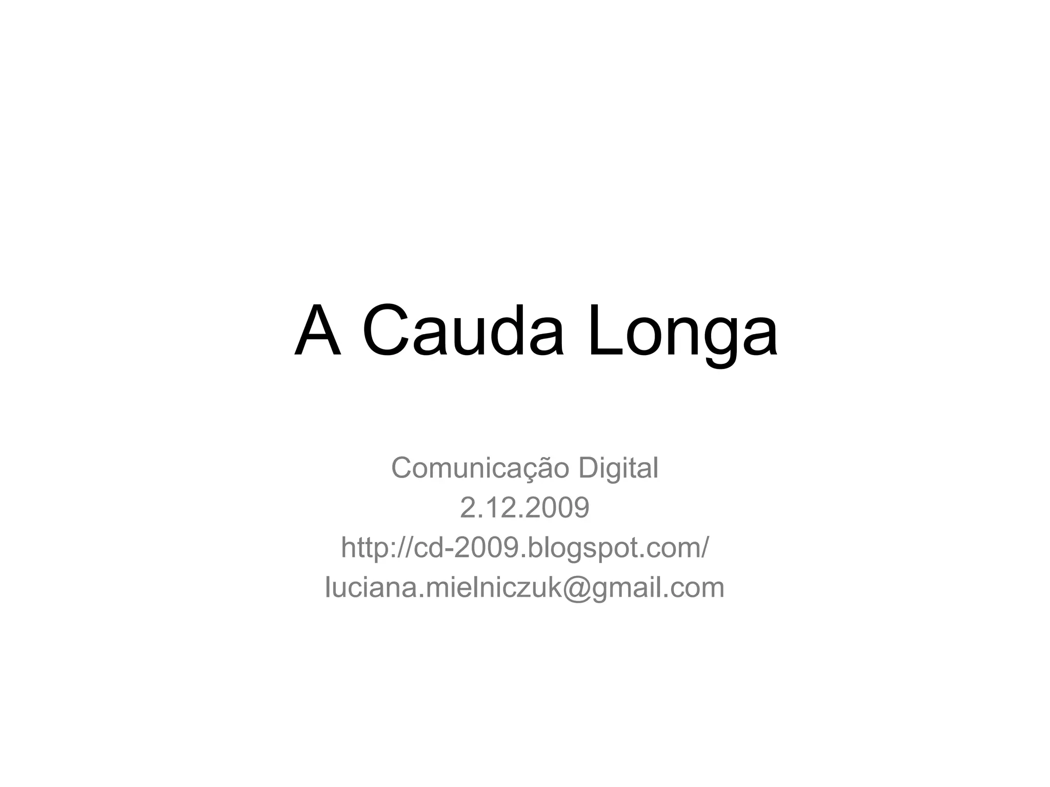 O documento discute a "Cauda Longa" no mercado digital. A economia digital concentra-se mais em nichos do que em sucessos. A internet permite oferecer produtos para nichos menores sem prejuízos. As três forças da Cauda Longa são: democratização das ferramentas de produção e distribuição e a ligação entre oferta e demanda por meio de buscas na internet.