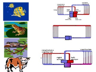 O documento descreve os diferentes tipos de sistemas circulatórios encontrados no reino animal, incluindo sistemas ausentes, abertos e fechados. Sistemas fechados podem ser simples ou duplos, e a circulação dupla pode ser completa ou incompleta. Exemplos de cada tipo de sistema são fornecidos para diferentes filos.