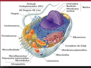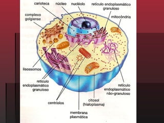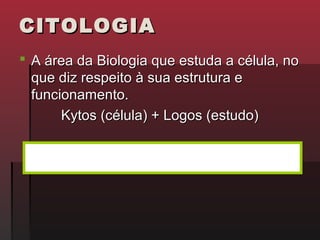 O documento discute a citologia, o estudo das células. Ele explica que todos os seres vivos são constituídos por células e descreve as principais estruturas celulares, incluindo a membrana, citoplasma, núcleo e organelas. O documento também diferencia células unicelulares e pluricelulares e discute as ferramentas usadas para estudar as células, como o microscópio.
