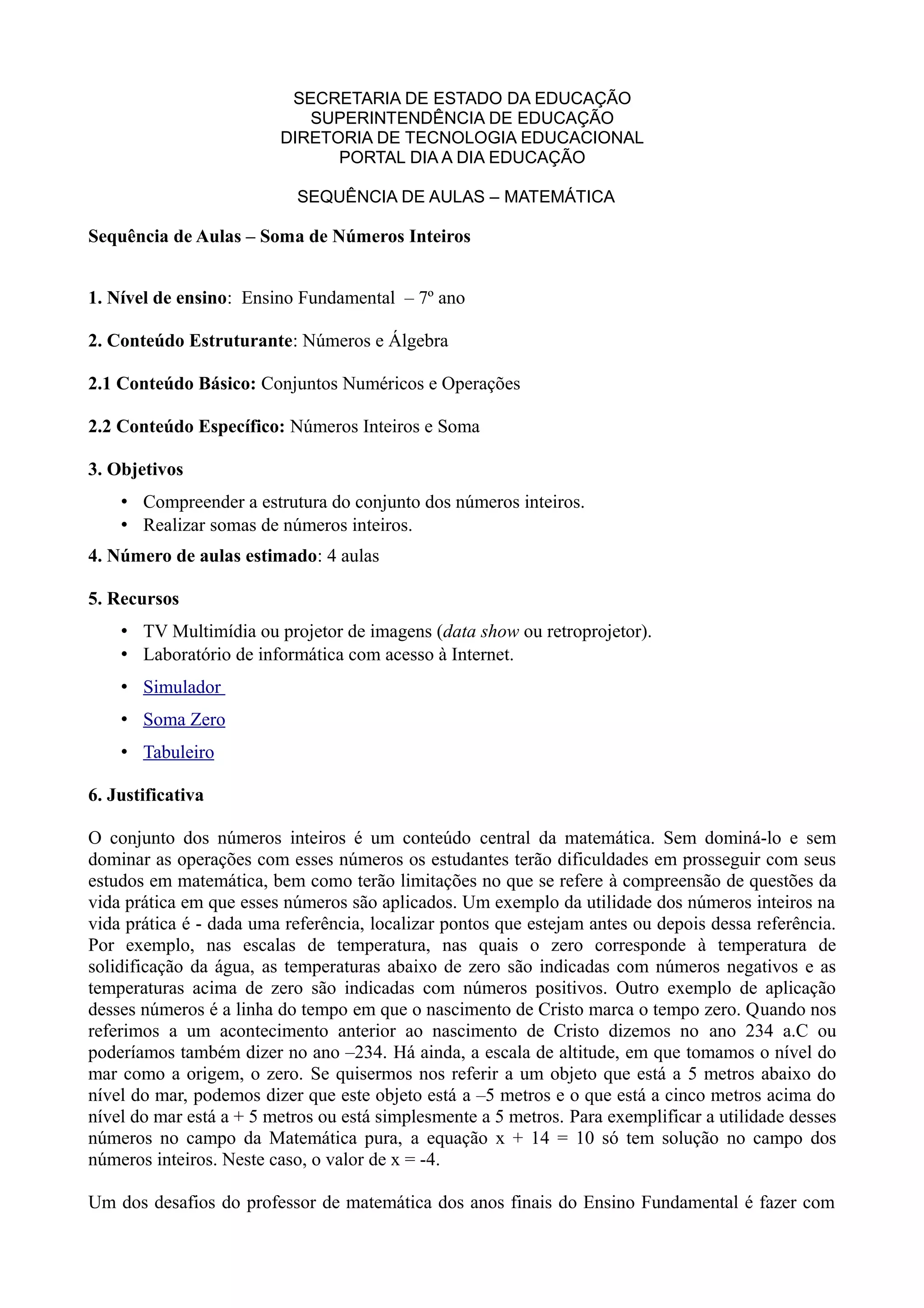 Este documento apresenta uma sequência de aulas sobre soma de números inteiros para o 7o ano do ensino fundamental. A sequência inclui 4 aulas e atividades que usam jogos, simuladores e discussões em grupo para ajudar os alunos a compreender a estrutura dos números inteiros e como realizar somas com esses números. O objetivo é preparar os alunos para aplicar esses conceitos em diferentes contextos como temperatura, altitude e finanças.
