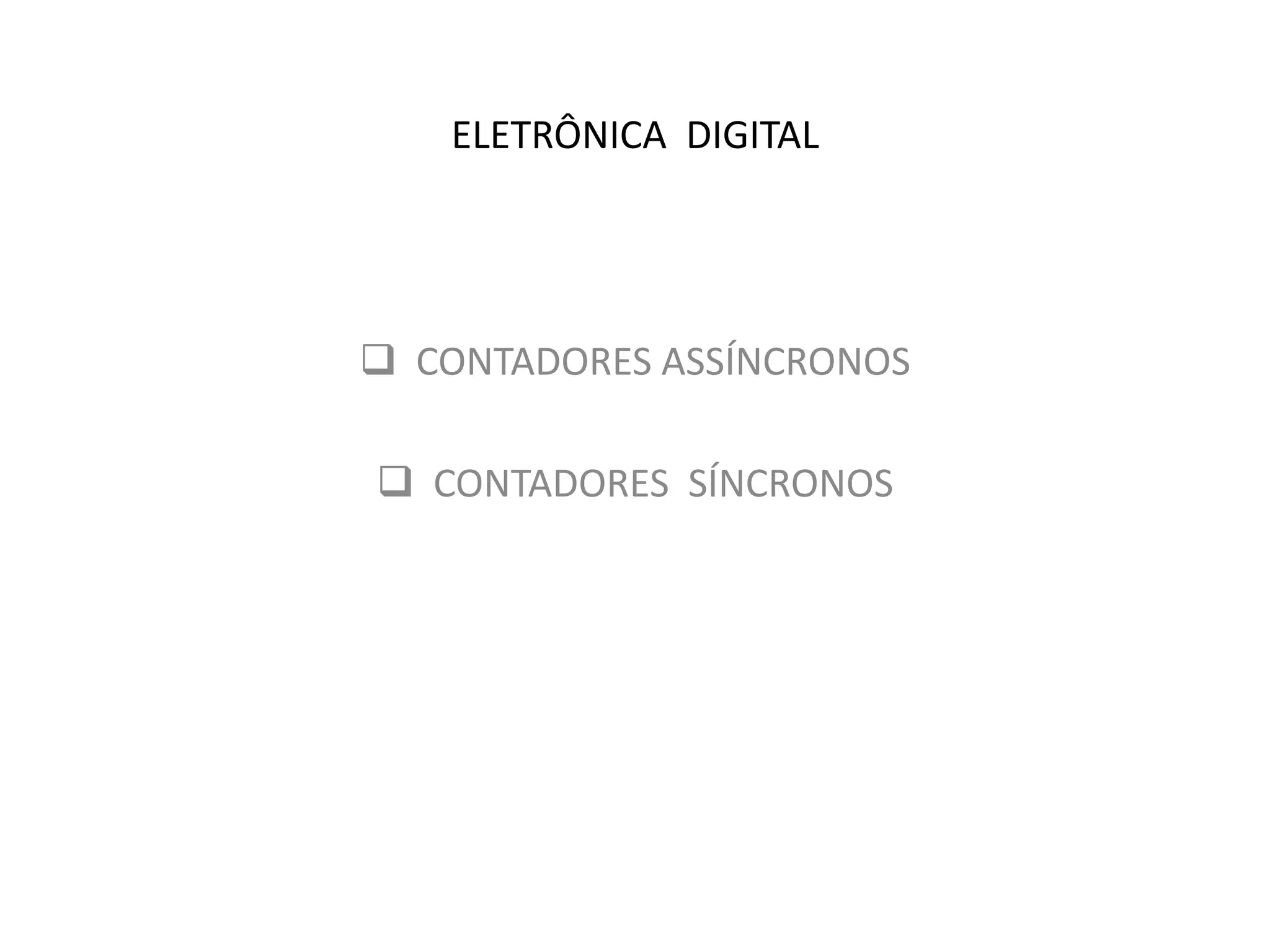 O documento discute diferentes tipos de contadores binários, incluindo contadores assíncronos crescentes e decrescentes. Contadores assíncronos são constituídos de flip-flops mestre-escravo ligados em cascata, onde a saída de um é o clock do próximo. Contadores assíncronos podem ser usados como divisores de frequência, onde a frequência da saída é dividida por potências de 2 a cada estágio.