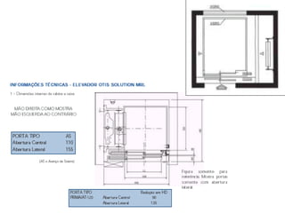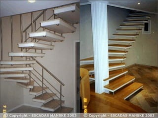 O documento apresenta desenhos e informações técnicas sobre escadas, incluindo seus tipos, dimensões, elementos e considerações para projeto. São mostrados exemplos de escadas em L, U, helicoidal e em um único lance, com especificações como largura, altura dos degraus e piso. A representação gráfica destaca a importância de dimensionar corretamente cada elemento para garantir funcionalidade e segurança.