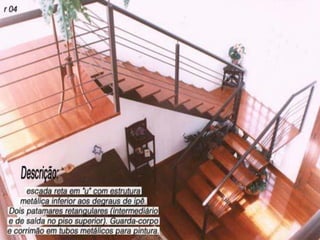O documento apresenta informações técnicas sobre projeto e dimensionamento de escadas, incluindo tipos de escadas, elementos, normas, fórmulas e representações gráficas. É descrito o processo de cálculo dos degraus, patamares e estruturas de sustentação considerando segurança e acessibilidade. Exemplos de projetos de escadas em "L", "U" e caracol são detalhados em plantas, cortes e vistas.