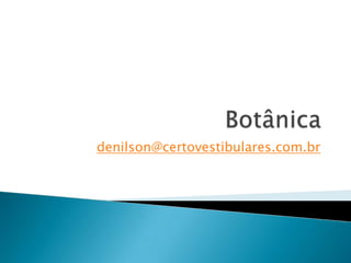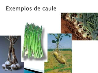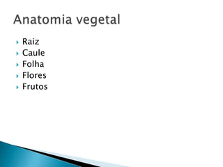 O documento descreve as principais partes das plantas, incluindo raízes, caules, folhas, flores e frutos. Ele explica a estrutura e função de cada parte e lista exemplos de diferentes tipos de cada estrutura, como raízes tuberosas, caules de colmo ou tronco, folhas simples e compostas, e diferentes tipos de frutos como bagas, drupas e vagens.