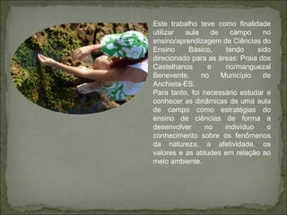O documento descreve uma pesquisa realizada no município de Anchieta-ES, Brasil, que teve como objetivo produzir um blog com informações e roteiros para a realização de aulas de campo nos ecossistemas da Praia dos Castelhanos e do rio/manguezal Benevente. A pesquisa caracterizou os ambientes, entrevistou professores e moradores locais, e desenvolveu o blog com detalhes sobre a área e orientações para visitas de estudo.