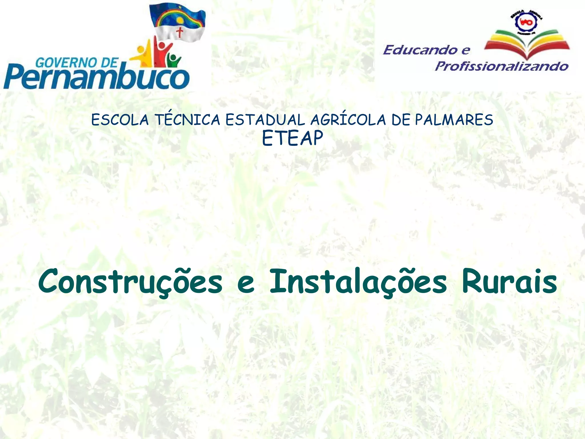 O documento descreve os principais materiais de construção utilizados em instalações rurais, incluindo pedra, areia, saibro, gesso, cal, betume, cimento, tijolos, telhas, manilhas, azulejos, madeira e ferro. Detalha as características, usos e cuidados necessários com cada material.
