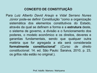 O documento discute conceitos e tipos de controle de constitucionalidade no Brasil. Resume os principais pontos como: 1) A definição de constituição e os sentidos sociológico, político e jurídico; 2) Os tipos de controle como preventivo e repressivo realizados pelos poderes legislativo e judiciário; 3) O controle concentrado via ação direta de inconstitucionalidade perante o STF.