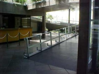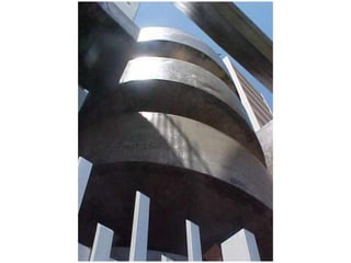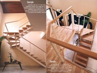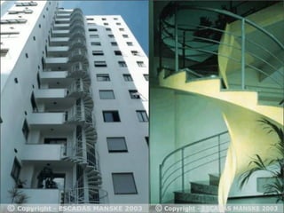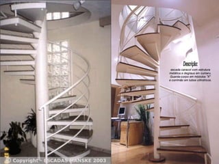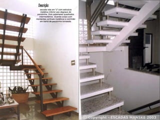 O documento discute projetos de escadas e rampas para circulação vertical em edifícios. Apresenta tipos de escadas como em L, U, caracol e lance único, além de dimensões, materiais e normas de segurança. Ressalta a importância do correto dimensionamento e representação gráfica para demonstrar a viabilidade das soluções e detalhes construtivos.