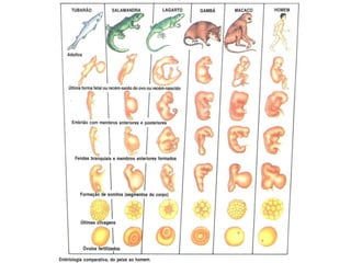 1) O documento discute a evolução de espécies ao longo do tempo e as principais teorias evolucionistas como o fixismo, lamarckismo e darwinismo.