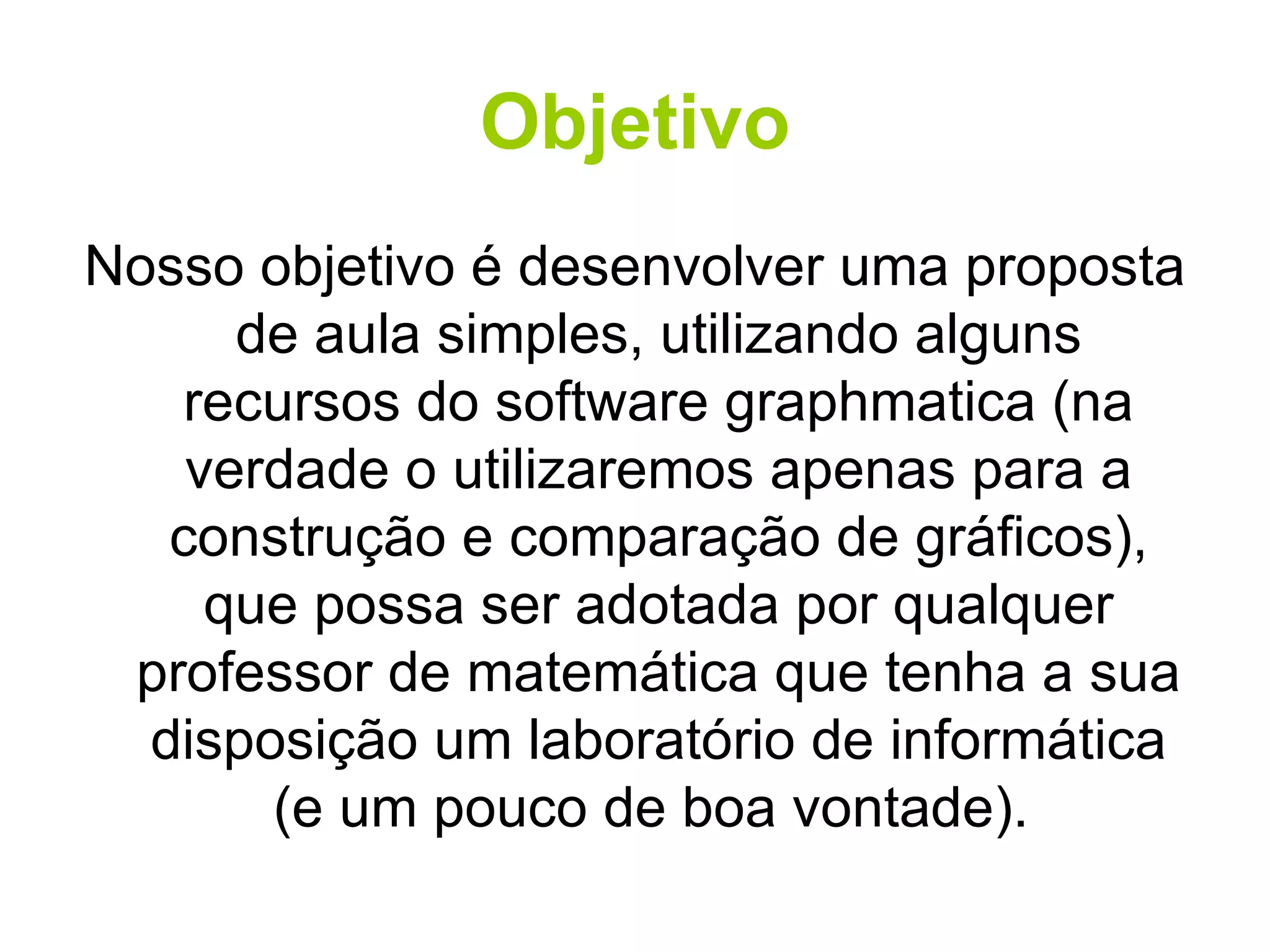 1) O objetivo é desenvolver uma proposta de aula para ensinar construção de gráficos de funções quadráticas usando o software Graphmatica.