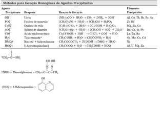 2) Os principais tipos de precipitação gravimétrica são discutidos, como fatores que afetam o tamanho das partículas e tratamento de precipitados coloidais.