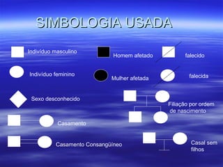 O documento descreve os principais elementos de um heredograma, incluindo símbolos para representar sexo, filiação, casamento, gêmeos e falecimento. Explica também conceitos como cruzamento-teste, retrocruzamento e genes letais, dando exemplos de doenças genéticas como a doença de Tay-Sachs.