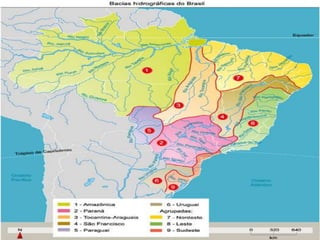 O documento descreve as principais características hidrográficas do Brasil, incluindo suas bacias hidrográficas, rios e usos da água. Destaca a Bacia Amazônica como a maior bacia do mundo e o potencial hidrelétrico da Bacia do Platina, que inclui os rios Paraná, Paraguai e Uruguai.
