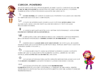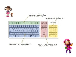 O documento apresenta as partes principais de um computador como o gabinete, teclado, mouse e monitor. Explica as funções básicas de cada parte e de teclas especiais do teclado como Enter, Backspace, Delete e Shift. Também descreve os botões do mouse e suas funções primárias.