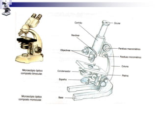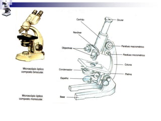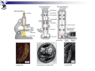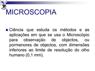 O documento discute a microscopia, classificando os microscópios de acordo com o número de lentes e princípio de iluminação. A história da microscopia óptica começou na antiguidade com lupas simples, tendo um renascimento no século XVII com contribuições de Hooke e Leeuwenhoeck, que observaram células e bactérias respectivamente. O desenvolvimento do microscópio eletrônico permitiu avanços na biologia celular.
