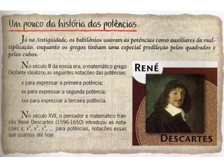 O documento aborda a temática da potência de um número real com expoente natural, apresentando definições e propriedades relacionadas. São fornecidos exemplos de cálculo de potências e comparações que levam a conclusões sobre suas propriedades. A obra é um trabalho acadêmico da área de informática educativa voltado para novas tecnologias no ensino de matemática.