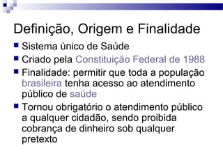 O documento descreve a história e os principais aspectos do Sistema Único de Saúde brasileiro (SUS). O SUS foi criado pela Constituição de 1988 com o objetivo de garantir o acesso universal e gratuito aos serviços de saúde. Ele é financiado por impostos e compreende centros de saúde, hospitais e outros serviços em três níveis de governo. O documento também explica conceitos como a atenção básica, saúde do trabalhador e os princípios do SUS, como a universalidade, integralidade