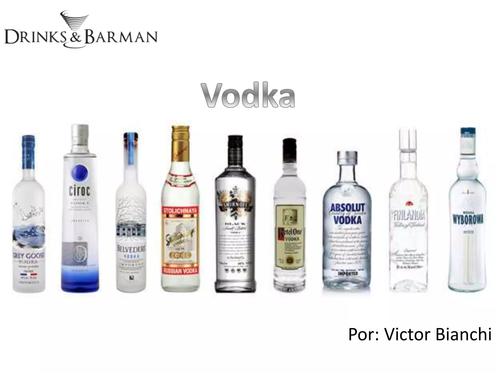 A história da vodka começou na Rússia em 1653 e se espalhou para outros países. Ela é produzida principalmente de cereais como centeio e é destilada e filtrada para remover impurezas, resultando em uma bebida alcoólica neutra e versátil para coquetéis. A qualidade e o preço variam de acordo com os ingredientes e processo de produção da vodka.