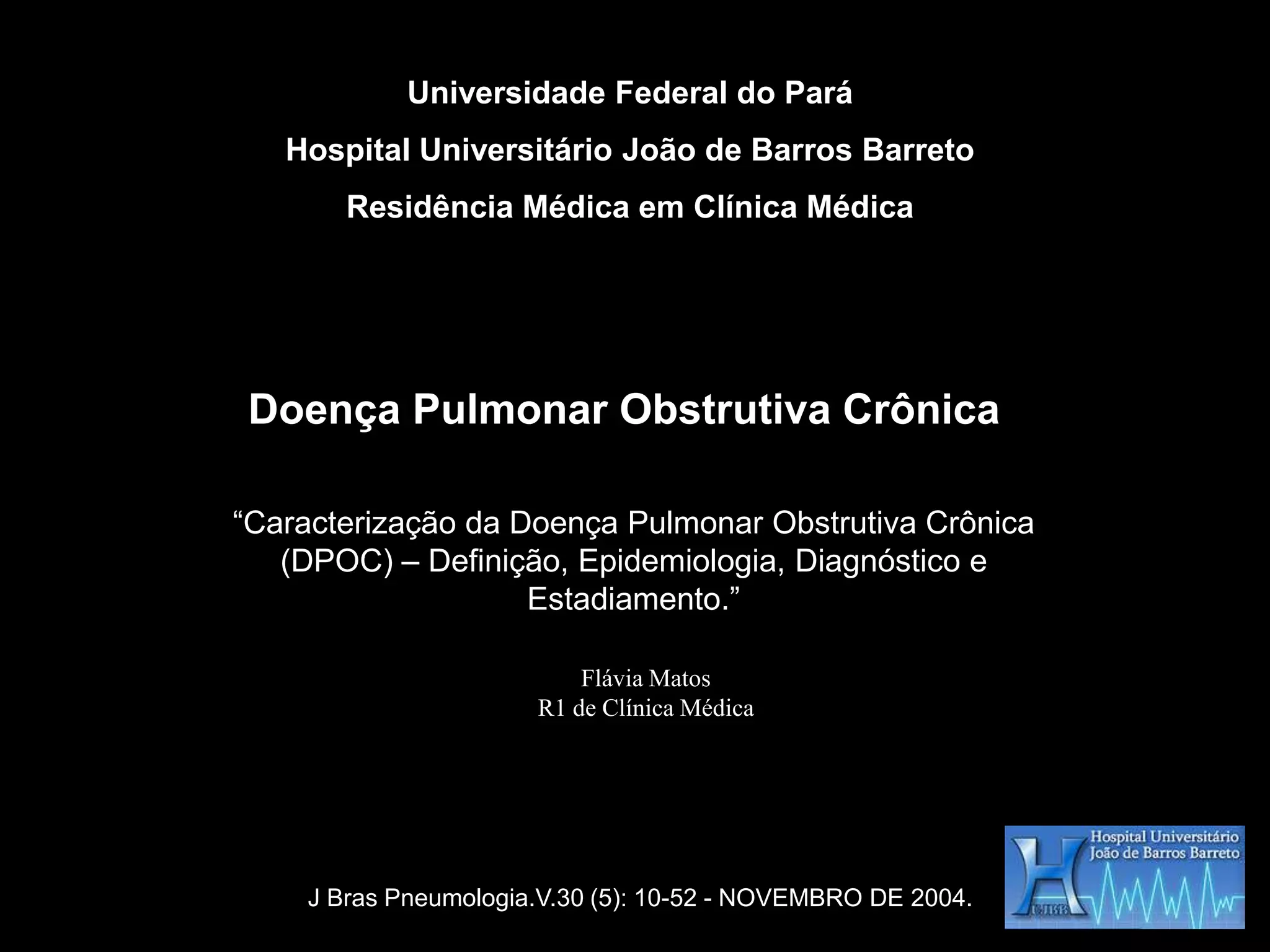 Este documento resume a Doença Pulmonar Obstrutiva Crônica (DPOC), definindo-a como uma patologia respiratória crônica caracterizada pela obstrução do fluxo aéreo, geralmente progressiva e causada primariamente pelo tabagismo. Ele descreve os fatores de risco, sintomas, diagnóstico, estadiamento e tratamento da DPOC, incluindo durante as exacerbações.