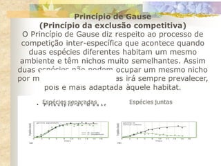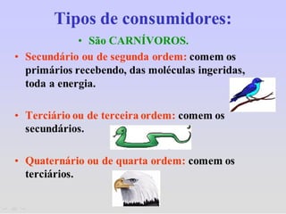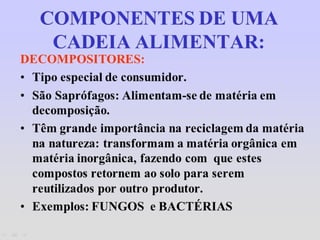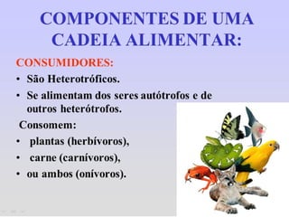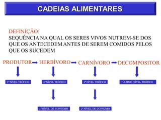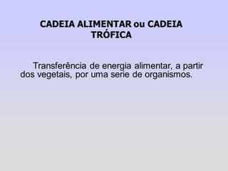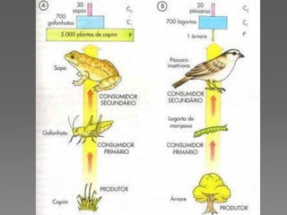 1) O documento discute conceitos como teia alimentar, cadeias alimentares, fluxo de energia e transferência de energia entre os níveis tróficos de um ecossistema.