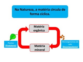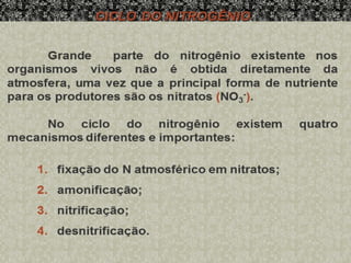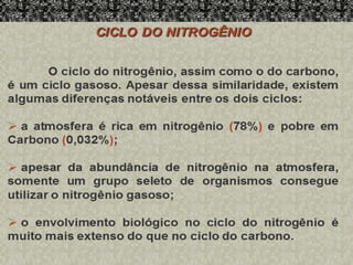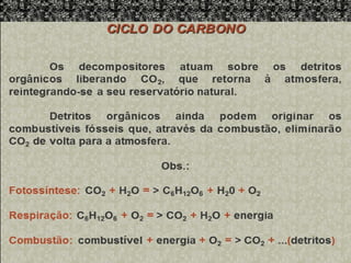 2) Apresenta os ciclos do carbono, oxigênio e nitrogênio que são elementos fundamentais para a vida.