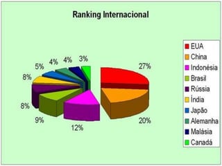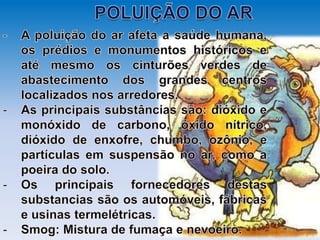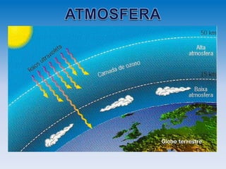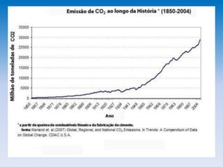 O documento discute o efeito estufa e o aquecimento global, explicando que os gases na atmosfera retêm calor e mantêm a temperatura da Terra adequada para a vida, mas que a atividade humana vem liberando mais gases causadores do efeito estufa, como o dióxido de carbono, aquecendo gradualmente o planeta e causando degelo polar e elevação do nível do mar.