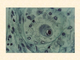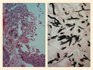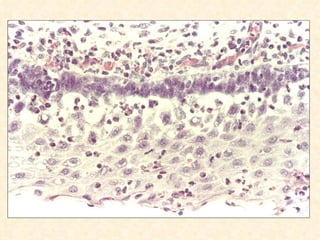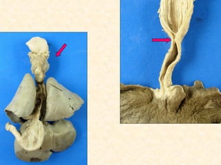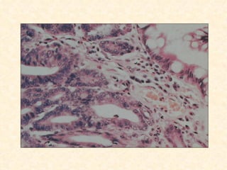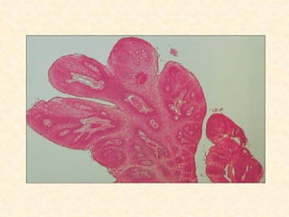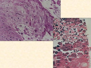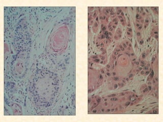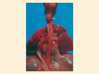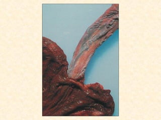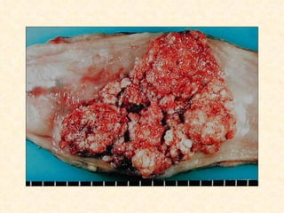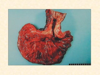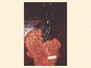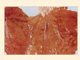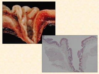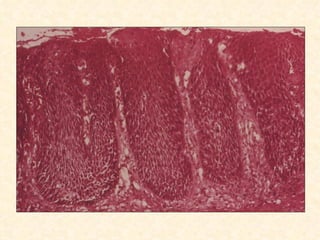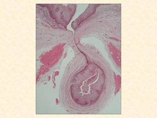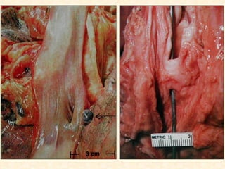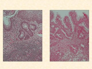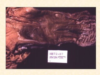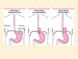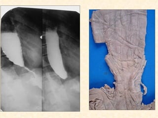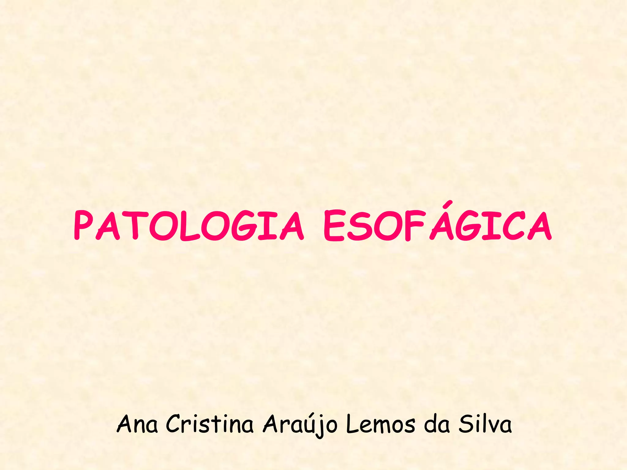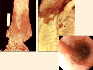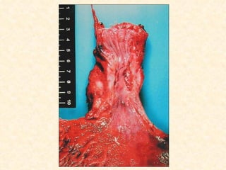 O documento descreve várias patologias esofágicas, incluindo anomalias congênitas como atresia esofágica e hérnia hiatal, lesões associadas à disfunção motora como acalásia, divertículos esofágicos, varizes esofágicas e esofagite. Também discute neoplasias benignas e malignas, com foco no carcinoma epidermóide esofágico, seu padrão de crescimento e sintomas clínicos.