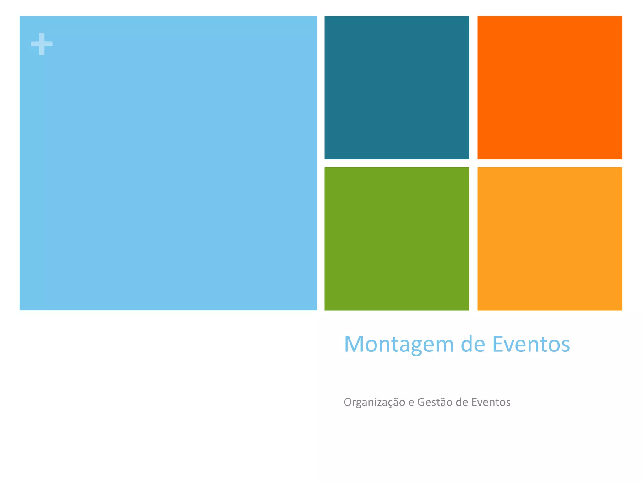 Este documento discute os principais elementos e etapas envolvidas na organização e montagem de eventos. Ele aborda tópicos como temática e formato do evento, programação, escolha do local, público-alvo, palco, iluminação, som, audiovisuais, serviço de alimentação, artistas, equipe, hospitalidade, cronograma de produção e contingências. O documento ressalta a importância de se considerar cada um desses aspectos para garantir o sucesso da produção.