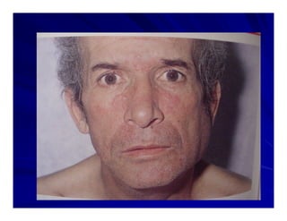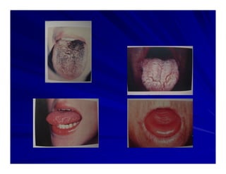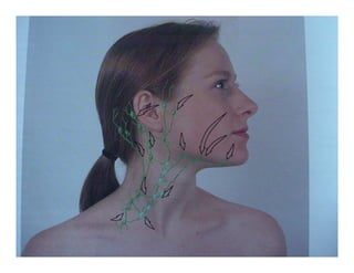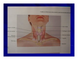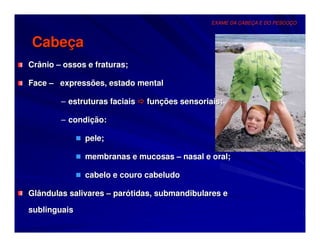 O documento descreve o exame físico da cabeça e pescoço, incluindo a inspeção e palpação do crânio, face, olhos, nariz, ouvidos, boca, pescoço, glândula tireóide e linfonodos. Fornece detalhes sobre os procedimentos e achados normais e anormais para cada estrutura anatômica.