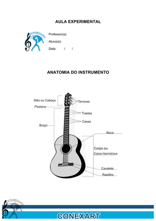 O documento fornece informações sobre a anatomia de um instrumento musical, incluindo cifras musicais com notas e alterações, detalhes sobre cordas soltas, tablatura, sinais musicais e conceitos de compasso.