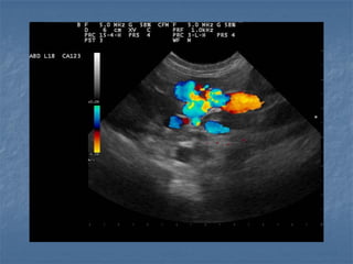 O documento descreve a anatomia, vascularização e protocolo de exame ultrassonográfico do fígado de forma detalhada. Alterações hepáticas comuns como cistos, abscessos, nódulos e cirrose são discutidas. Vários tipos de shunts portossistêmicos são definidos e classificados.