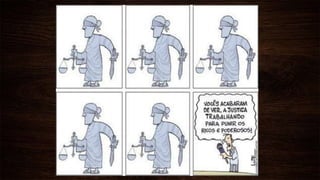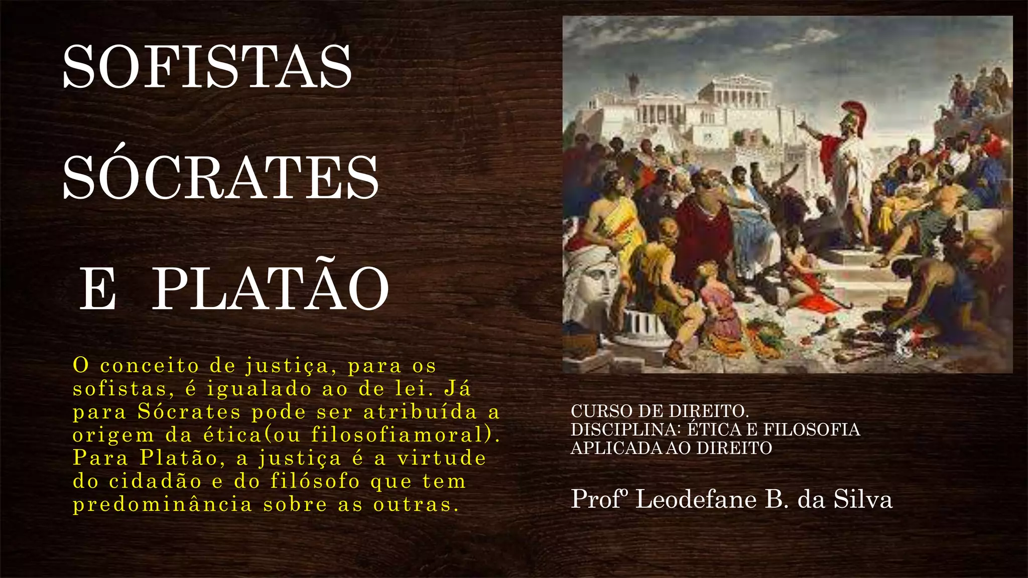 O documento discute as visões de justiça de sofistas, Sócrates e Platão na Grécia Antiga. Para os sofistas, a justiça é igual à lei vigente. Já Sócrates atribuiu a origem da ética, tendo questionado o relativismo dos sofistas. Platão considerou a justiça como a virtude do cidadão e do filósofo, que prevalece sobre as outras.