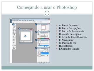 Este documento fornece instruções sobre como começar a usar o Photoshop, incluindo as barras de menu e ferramentas, e como criar um documento, duplicar camadas, ajustar brilho, contraste e cores, e transferir uma foto para um cartaz.