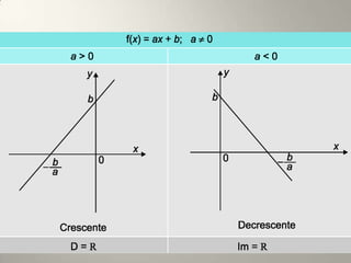 Este documento resume os principais conceitos de funções do 1o e 2o grau. No 1o grau, explica a forma geral da função linear f(x)=ax+b e conceitos como crescimento, decrescimento, raiz e estudo do sinal. No 2o grau, aborda a forma geral da parábola f(x)=ax2+bx+c, conceitos como vértice, concavidade, raízes e estudo do sinal.