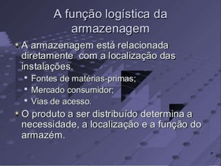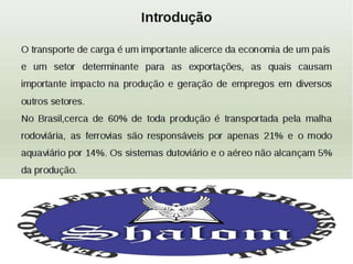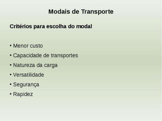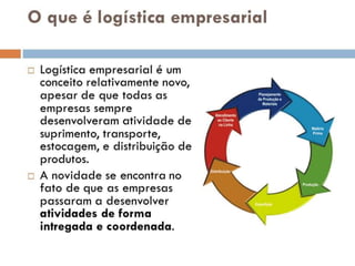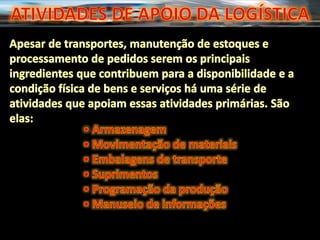 O documento discute os principais conceitos e atividades logísticas, incluindo transporte, armazenagem, processamento de pedidos e gerenciamento da cadeia de suprimentos. Também descreve como a tecnologia da informação tem melhorado a eficiência dos processos logísticos.
