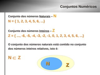 O documento discute conjuntos numéricos e funções matemáticas. Apresenta os conjuntos dos números naturais, inteiros, racionais e reais, além de exemplos de funções como identidade, constante, linear, afim e quadrática. Explica também o plano cartesiano e como representar graficamente diferentes tipos de funções.