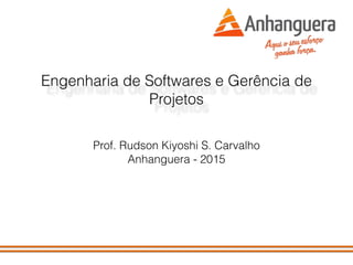 O documento apresenta as informações sobre o curso de Engenharia de Softwares e Gerência de Projetos ministrado pelo professor Rudson Kiyoshi S. Carvalho na Anhanguera em 2015. Ele descreve o calendário e sistema de avaliação do curso, que inclui ATPS (Atividades de Trabalho de Projeto Supervisionado) e provas. O documento também fornece detalhes sobre os requisitos e entregas dos relatórios do ATPS, como escopo, cronograma e requisitos do projeto de software.