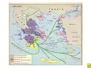 O documento descreve a história da Grécia antiga, dividida em períodos: Pré-Homérico (XX-XII a.C), Homérico (XII-VIII a.C), Arcaico (VIII-VI a.C), Clássico (VI-IV a.C) e Helenístico (III-I a.C). Destaca as cidades-estado de Esparta e Atenas, com diferentes características políticas, sociais e econômicas. Atenas desenvolveu a democracia no período Clássico, permitindo a particip