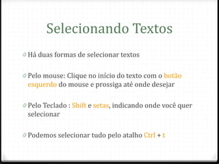O documento fornece instruções sobre como formatar e editar texto em um documento do Microsoft Word. Ele explica como selecionar, copiar, colar e recortar texto, além de como criar, salvar, abrir e formatar documentos usando atalhos de teclado e ferramentas. O documento também discute como adicionar colunas, marcas d'água e configurar outros aspectos do documento.