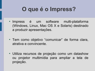 O documento discute como criar apresentações efetivas usando o software Impress do OpenOffice, fornecendo dicas sobre estrutura, elementos visuais, estilo e qualidade de slides. É explicado que o Impress pode ser usado para criar apresentações em diferentes plataformas com o objetivo de comunicar de forma clara. Dicas como usar poucas palavras e frases por slide, escolher boas fontes, cores e fundos simples são dados.