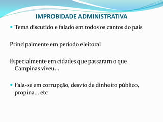 O documento discute o tema da improbidade administrativa no Brasil. Ele define o que é improbidade administrativa e quais são as principais leis que tratam do assunto, como a Constituição Federal e a Lei de Improbidade Administrativa. Também descreve as três modalidades de atos de improbidade previstos na lei: atos que importam em enriquecimento ilícito, dano ao erário e violação de princípios.