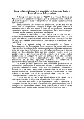 A Fadep realizou a aula inaugural da segunda turma do curso de pós-graduação em Gestão e Desenvolvimento de Cooperativas em parceria com a PUC/PR e o Sescoop/PR. O curso tem como objetivo melhorar o entendimento sobre o cooperativismo para aplicar no atendimento e desenvolvimento de cooperativas. A turma conta com mais de 45 alunos interessados no tema, incluindo profissionais que trabalham em cooperativas.