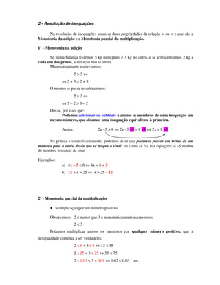 O documento explica as diferenças entre equações e inequações do 1o grau, como resolver inequações usando propriedades de adição e multiplicação, e fornece exemplos resolvidos. As propriedades incluem: adicionar/subtrair o mesmo número a ambos os membros sem alterar o sinal, e multiplicar por um número positivo/negativo pode requerer inverter o sinal.