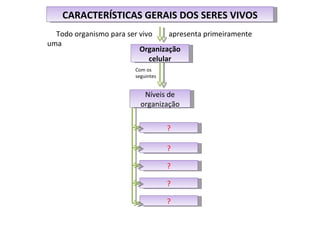 O documento orienta a construção de um mapa conceitual sobre as características gerais dos seres vivos, abordando temas como organização celular, metabolismo e ciclo vital. Os alunos são incentivados a interagir com jogos educativos online relacionados ao assunto. A atividade é direcionada pela disciplina de Ciências, sob a orientação do professor André Gruimarães Machado para a turma A do 7º ano da Escola Estadual São Francisco de Assis.