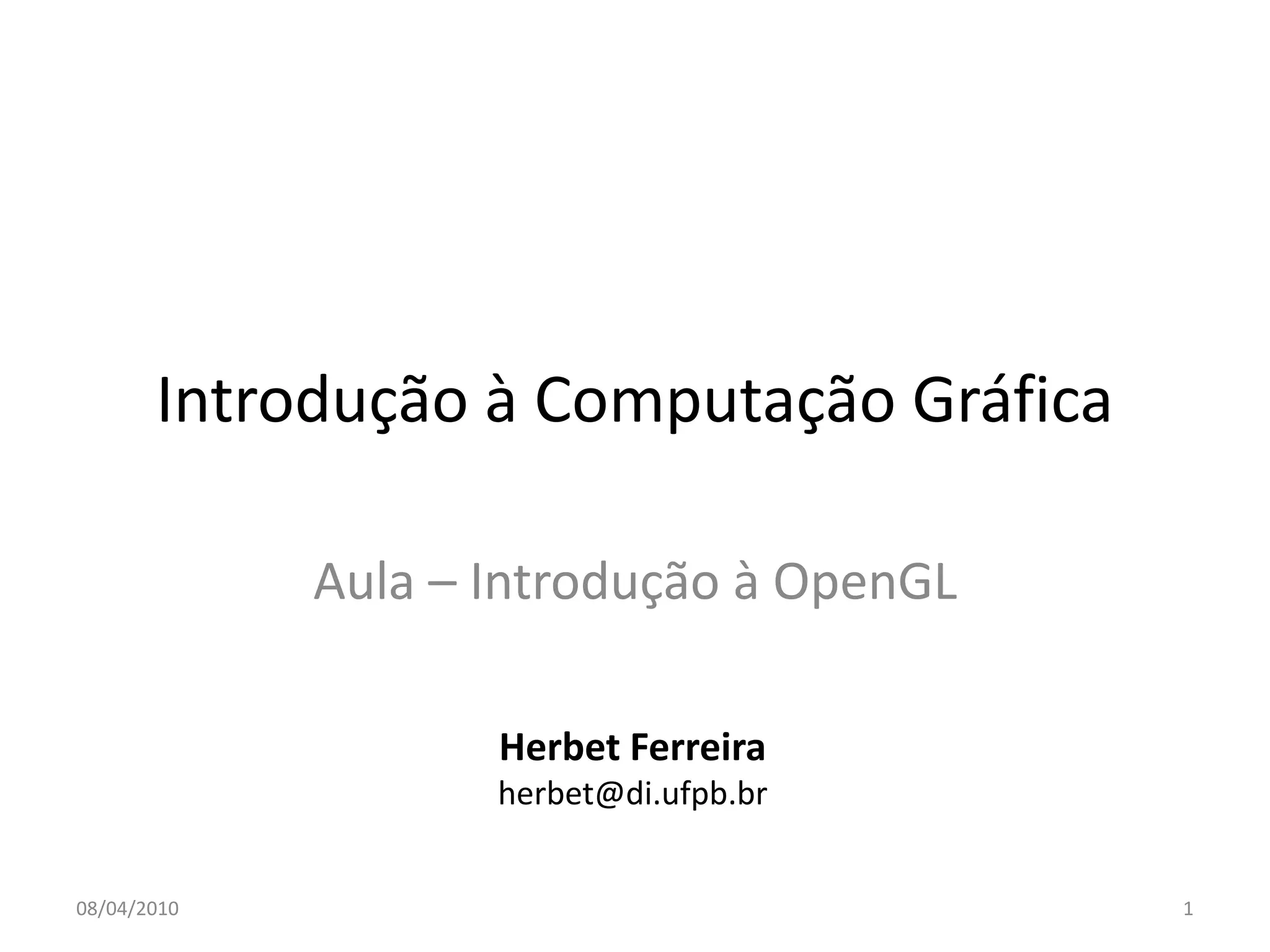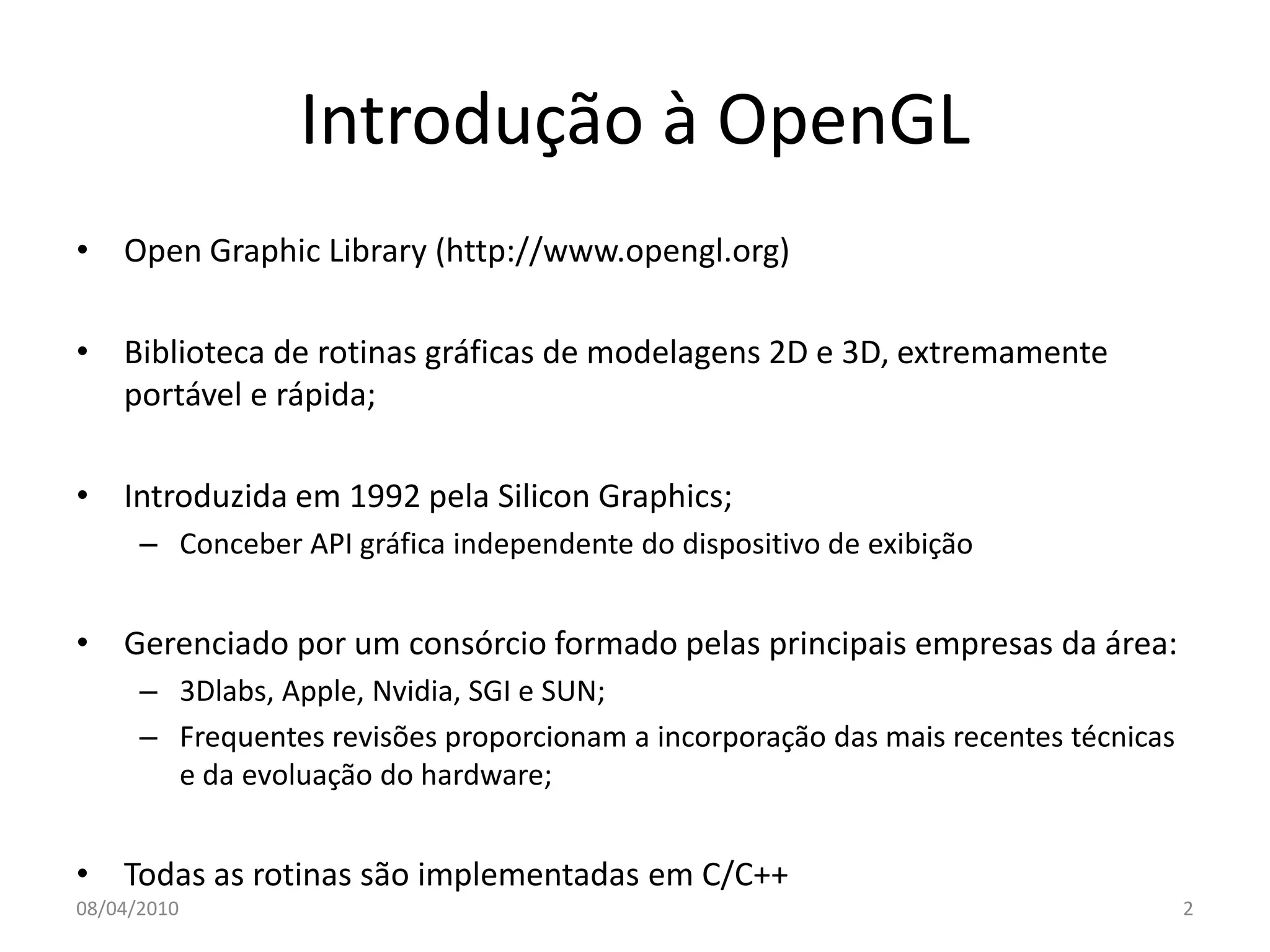 O documento apresenta uma introdução à OpenGL, uma biblioteca gráfica para modelagens 2D e 3D, destacando suas características, restrições e implementações. Ele inclui um exemplo de programa básico em OpenGL e discute a estrutura do código, callbacks e primitivas de desenho. Além disso, sugere exercícios práticos para aperfeiçoar o entendimento da biblioteca.