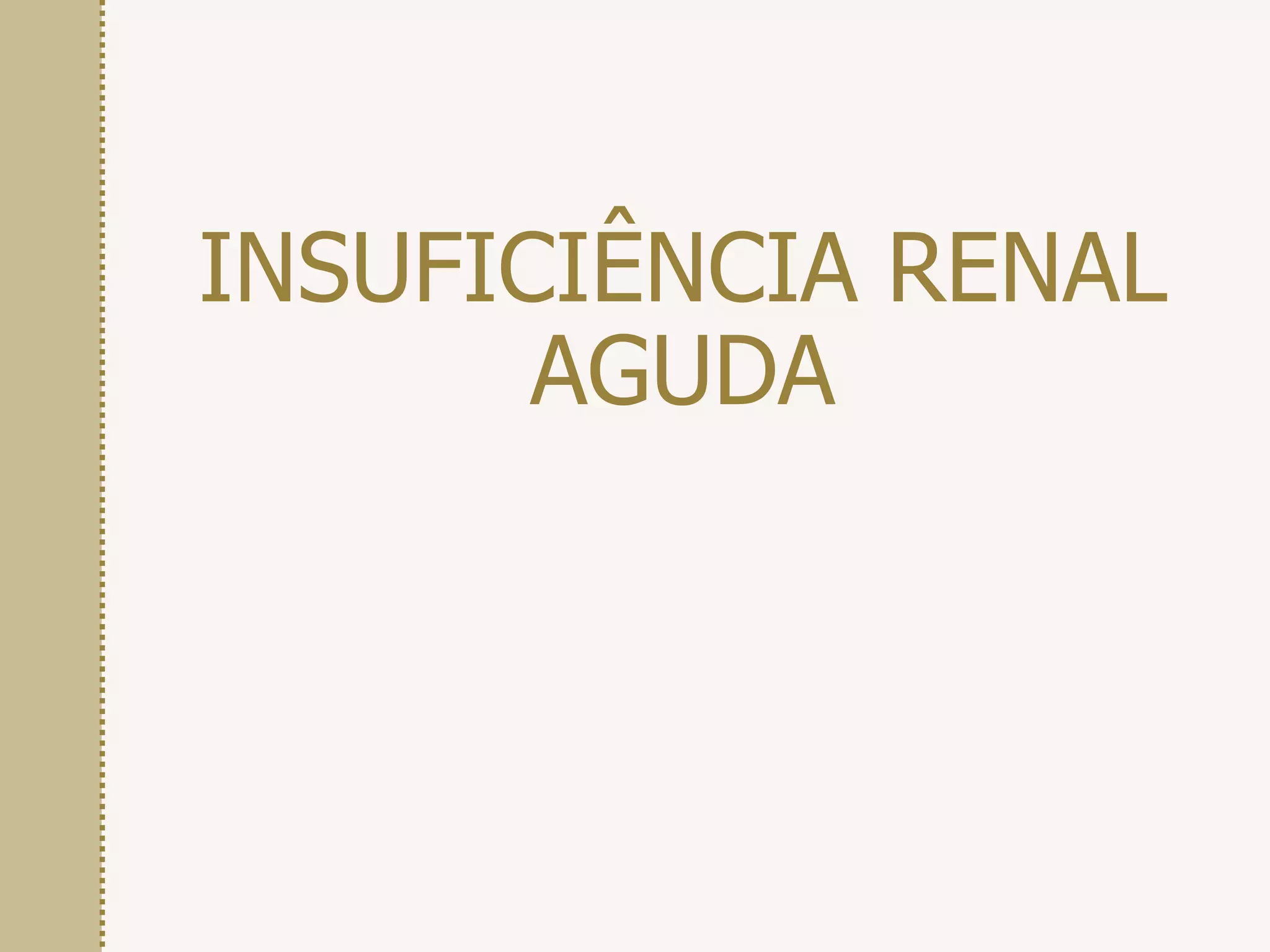 O documento descreve a insuficiência renal aguda (IRA), definindo-a como uma perda súbita da função renal com retenção de produtos tóxicos e volume urinário variável. Detalha como diagnosticá-la através da dosagem de creatinina e taxas de filtração glomerular, e classifica a IRA em pré-renal, pós-renal e renal. Apresenta também suas complicações, tratamentos como hemodiálise e diálise peritoneal, e altas taxas de mortalidade associadas à condição.