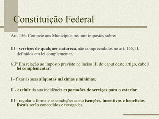 O documento discute aspectos constitucionais e legais do Imposto sobre Serviços de Qualquer Natureza (ISS). O ISS incide sobre serviços listados em lei complementar, prestados no território do município. Compete à lei complementar definir alíquotas, regular isenções, e estabelecer critérios como local da prestação e responsabilidade por substituição tributária. Existem controvérsias sobre a base de cálculo para serviços pessoais.