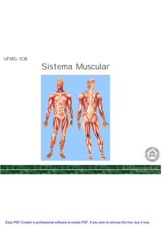 O documento descreve o sistema muscular, incluindo: 1) conceito de músculo, componentes e classificação; 2) variedade de músculos como estriados e lisos; 3) componentes anatômicos dos músculos estriados como porções e origem/inserção.