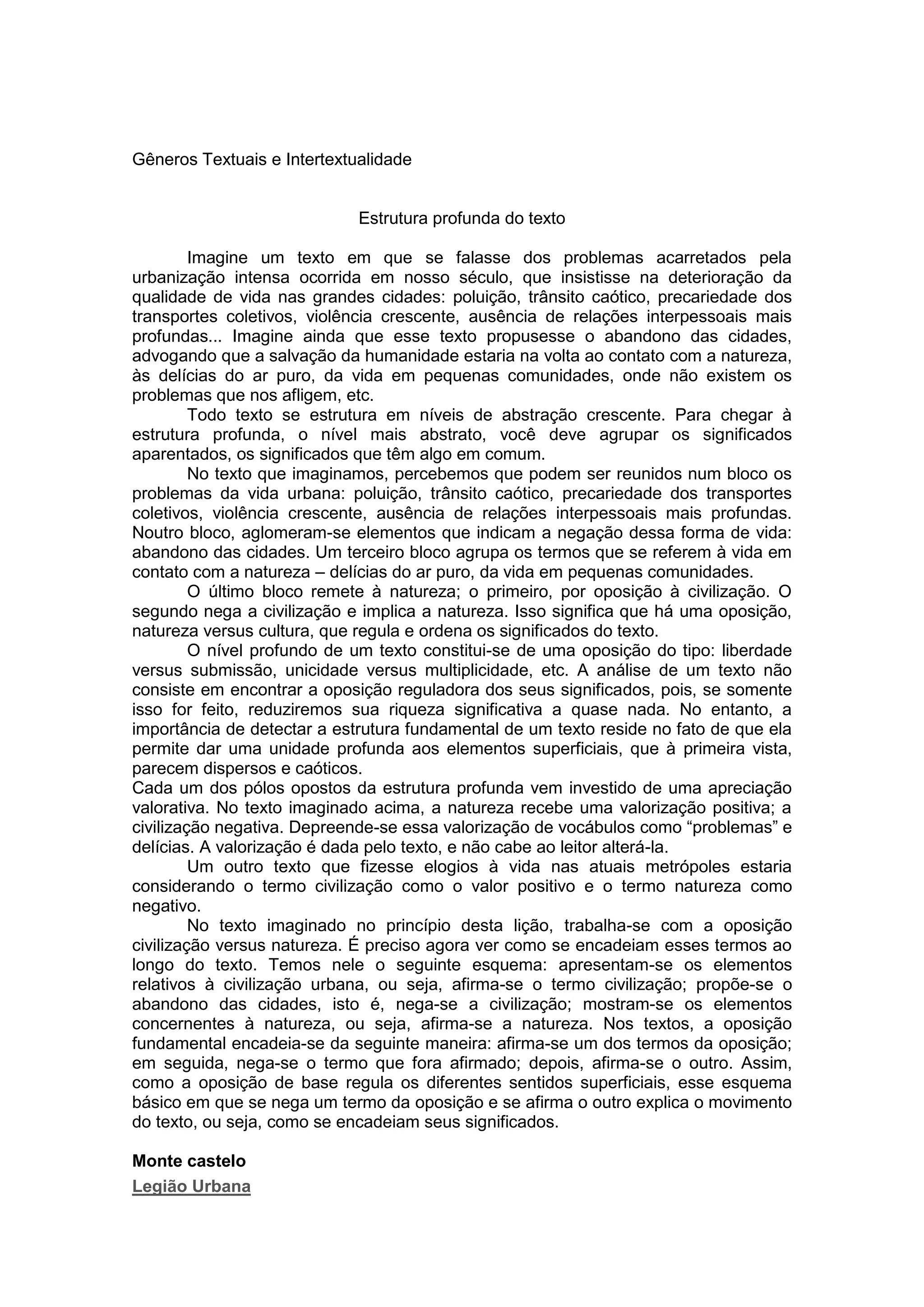 O documento discute a estrutura profunda dos textos, definida como uma oposição fundamental, como natureza versus cultura. Analisa como os significados de um texto imaginado se encadeiam de acordo com essa estrutura, afirmando um termo, negando-o e afirmando o oposto. Também aborda a valorização positiva ou negativa dos termos da oposição de acordo com o texto.