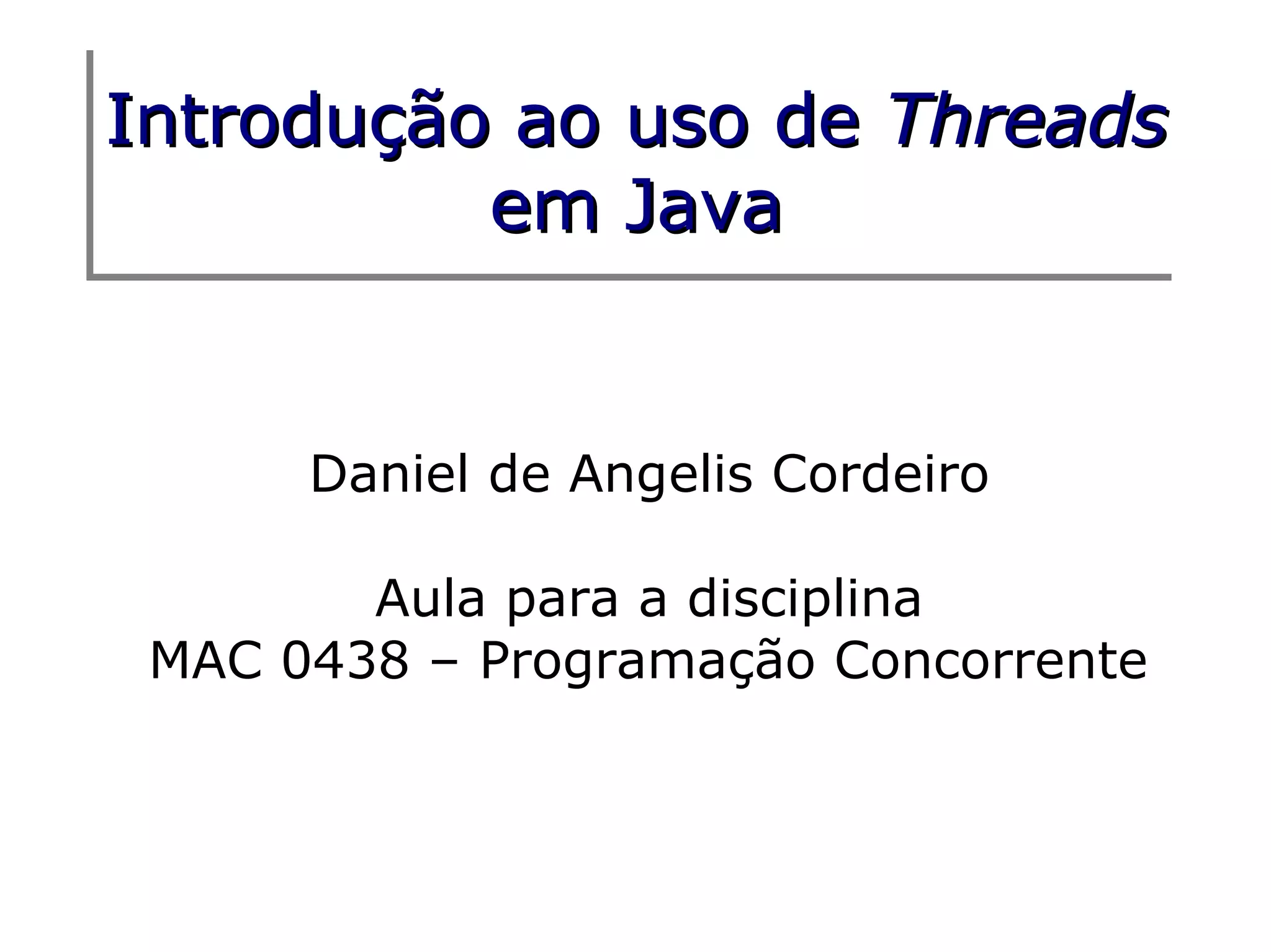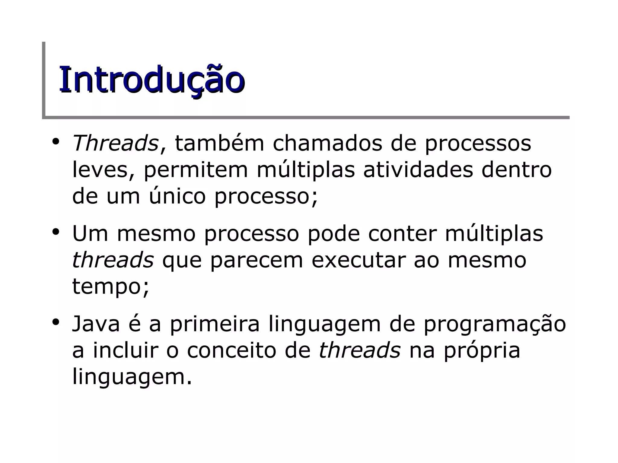 Este documento apresenta uma introdução ao uso de threads em Java. Ele explica que threads permitem múltiplas atividades dentro de um processo e que Java suporta threads nativamente. Também mostra como criar threads usando herança ou interface Runnable, e demonstra um exemplo de uso. Por fim, discute estados de threads, sincronismo, variáveis voláteis e os métodos wait(), notify() e notifyAll().